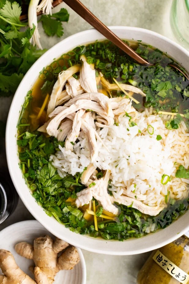 The broth for this Asian chicken and rice soup can be stored in the refrigerator for 3–4 days. When ready to enjoy, reheat it in a saucepan over low heat. It’s fine to store the broth with the chicken, but don’t add the rice directly to the pot, it will absorb all the liquid during storage. Keep in mind that the flavors will intensify as they sit: the garlic will become more pronounced, and the ginger a bit more pungent.