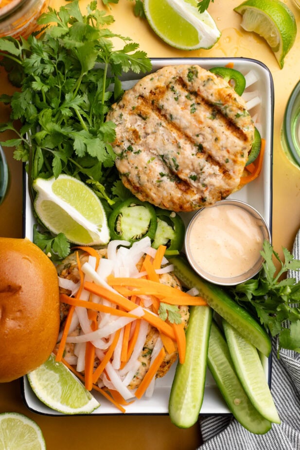 These Banh Mi–inspired salmon and shrimp burgers take all the familiar, beloved flavors of a Banh Mi—a juicy, tangy pickle, fresh, crisp vegetables, and a hearty protein—and turn them into a burger.