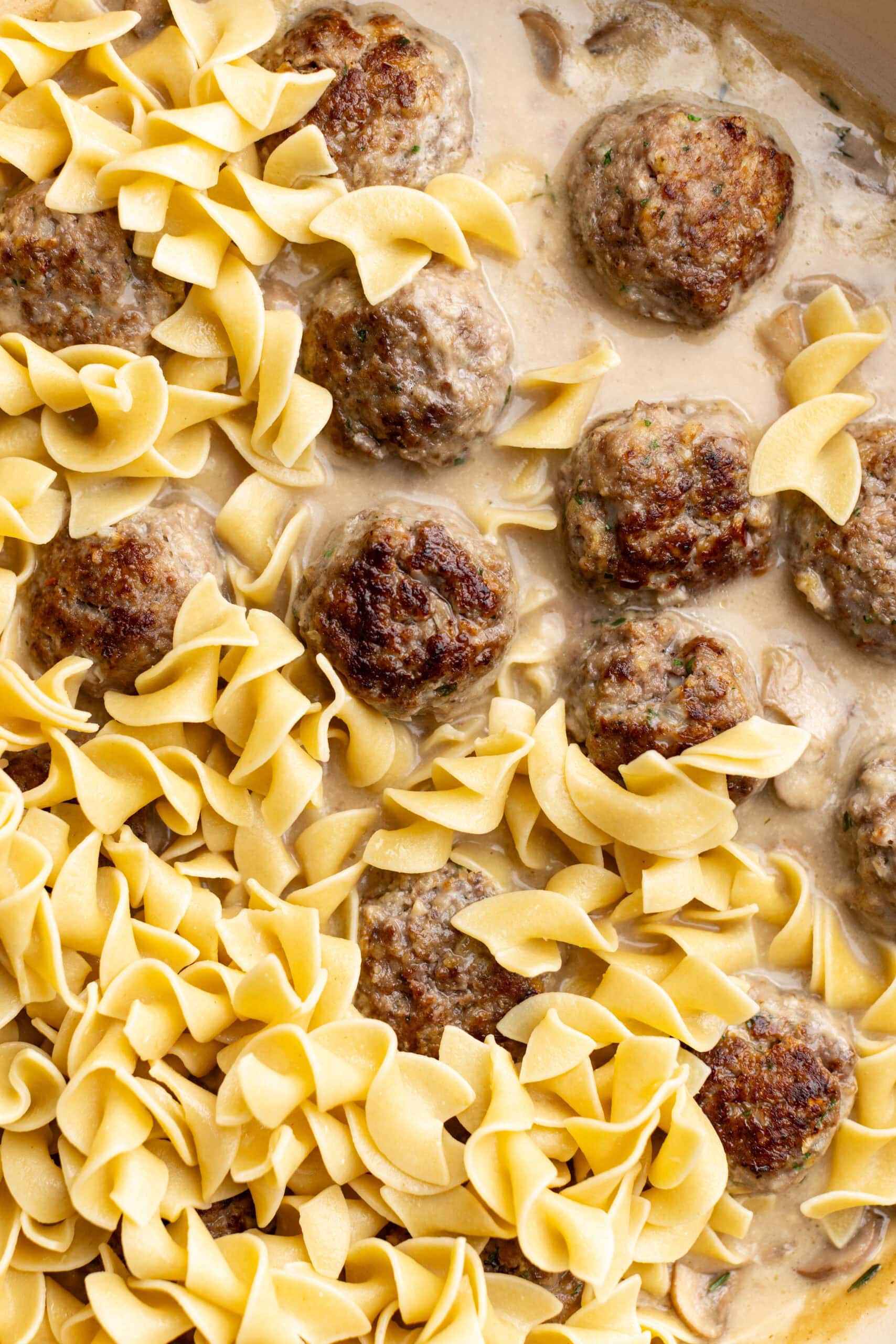 Stir in the heavy cream and mix to combine. Add the meatballs back to the pan and simmer uncovered for another 5–7 minutes. The sauce will continue to thicken, and the meatballs will finish cooking, flip them midway through. Once fully cooked, add the egg noodles, toss to coat, and serve!