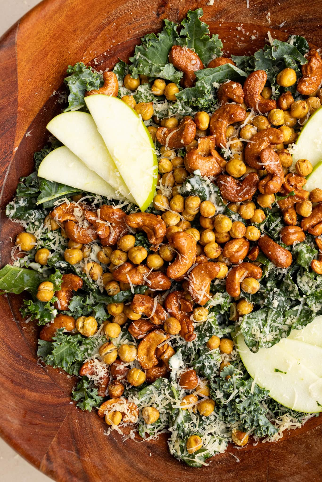 Dress + Assemble – To the kale, add the desired amount of dressing along with additional grated Gouda and toss to coat. Finish the salad by adding the crispy chickpeas, sliced or diced apples, and candied chickpeas. Serve immediately.