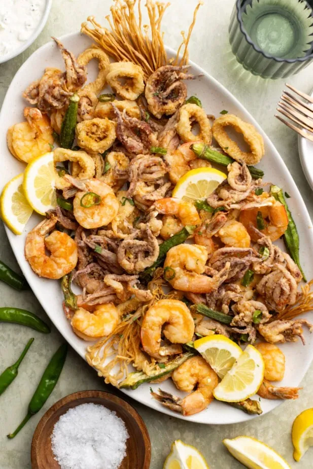 Light and crispy, this Fritto Misto is coated in a thin cornstarch-and-flour breading and fried till golden and crunchy. The result is a delicate, non-greasy bite where the seafood flavor really shines. Perfect for holiday entertaining or summer cookouts, this Fritto Misto is easier to make than you might think. If you love calamari but want something lighter than the heavily breaded versions, this recipe is definitely worth a try.