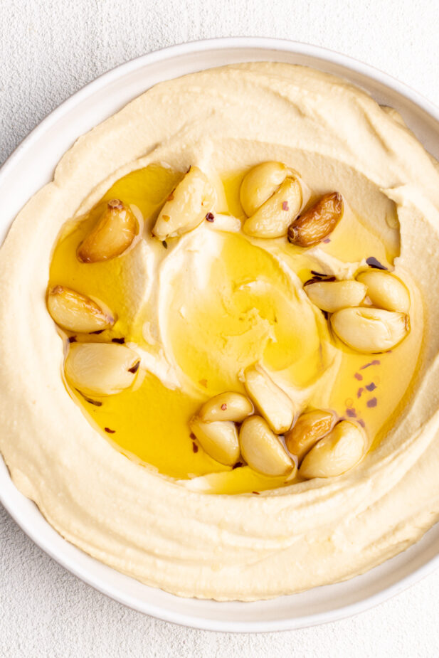 If you haven’t checked out my basic hummus recipe, no worries! All the instructions for garlic confit hummus are below.