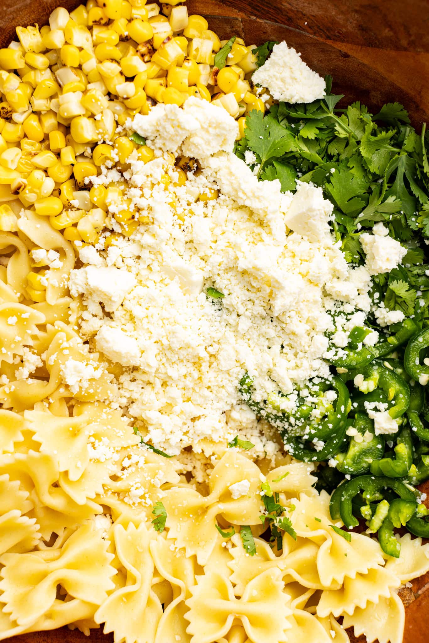 3. Make the Base + Assemble – In a large bowl, combine the crema Mexicana, lime juice, and cayenne pepper. Add the cooled, rinsed pasta, corn, chopped jalapeños, cilantro, and cheese. Give the bowl a thorough toss to coat all the pasta and evenly distribute the other ingredients. Add kosher salt to taste. If you prefer your pasta to have a bit more coverage, feel free to add more crema.