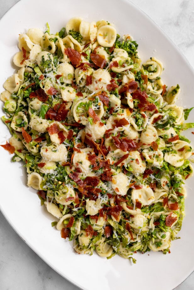 Add the Greens + Finish –Add the broccoli rabe and shaved Brussels sprouts to the skillet with a pinch of salt. Sauté for 5–6 minutes, until the vegetables are tender but still a vibrant green. You want them to keep some texture, so try not to overcook. Add the pasta and toss everything together. Finish with a generous grating of Pecorino Romano and a drizzle of extra virgin olive oil.