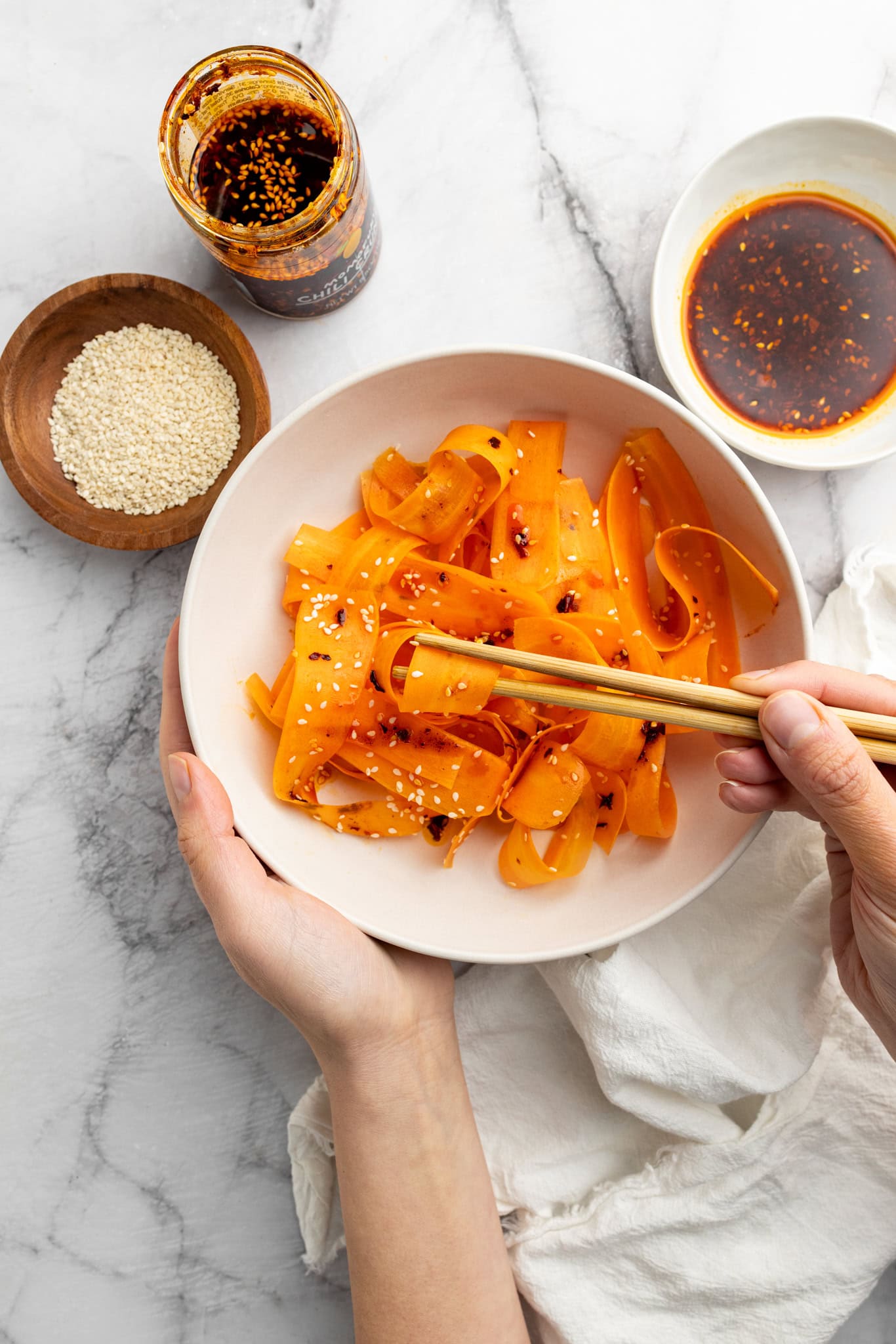 • Chili Crisp – Open my fridge and you will find 3-4 chili crisps opened at once. Over the past few years, chili crisp has gone from being a product you needed to go to a specialty market for to overpopulating the shelves of your favorite chain supermarket. For this recipe, avoid a chili crisp with Sichuan peppers. While I love these varieties, I found the Sichuan flavor overpowered the carrots. Instead, opt for one in which garlic and onions are at the forefront of the sauce, such as the Momofuku Chili Crunch or even the Trader Joe’s Chili Onion Crunch.