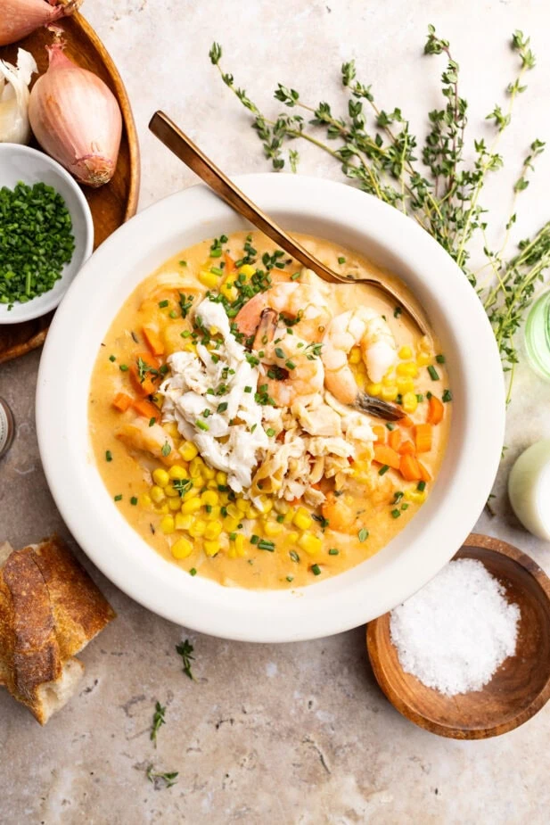 Imagine combining the rich broth of a lobster bisque with the hearty, chunky texture of a chowderโ€”then loading it with more seafood than filler. Thatโ€™s exactly what this Creamy Seafood Chowder is. Designed for true seafood lovers, this comforting bowl delivers restaurant-quality flavor and indulgence, all from the comfort of your home. Its easy (I’m looking at you beginners) but bold enough to wow a crowd. Packed with carrots, corn, potatoes and a truck load of seafood this chowder might just become your next favorite soup.