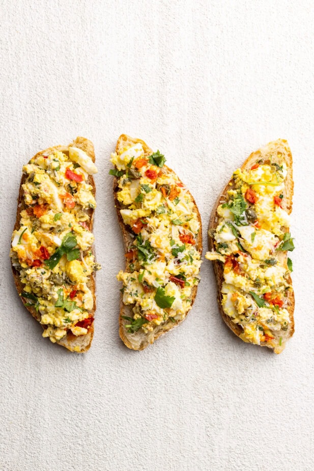 Eggs are expensive—make them worth it! This spicy egg salad puts a bold twist on the classic. Smashed eggs combine with spicy Calabrian chilies, tangy mustard, capers, herby cilantro, and, of course, salty Parmesan. Enjoy it on a crusty crostini or in a sandwich—this egg salad is packed with bold flavor and far better than what you grew up eating.