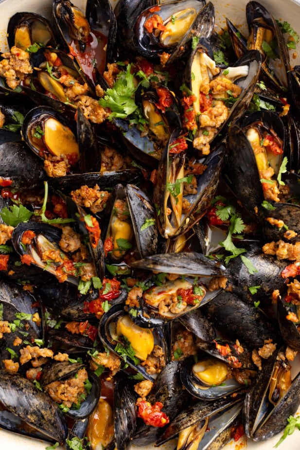 Cook the Mussels – Toss in the mussels and cover the pot with a lid. Cook for about 5-7 minutes, or until the mussels are fully open. I like to open the lid around the 3 minute mark and give them a stir to ensure even cooking. Once the mussels are done, add the sausage, along with any fat or liquid from the bottom of the bowl, plus a generous amount of chopped cilantro.