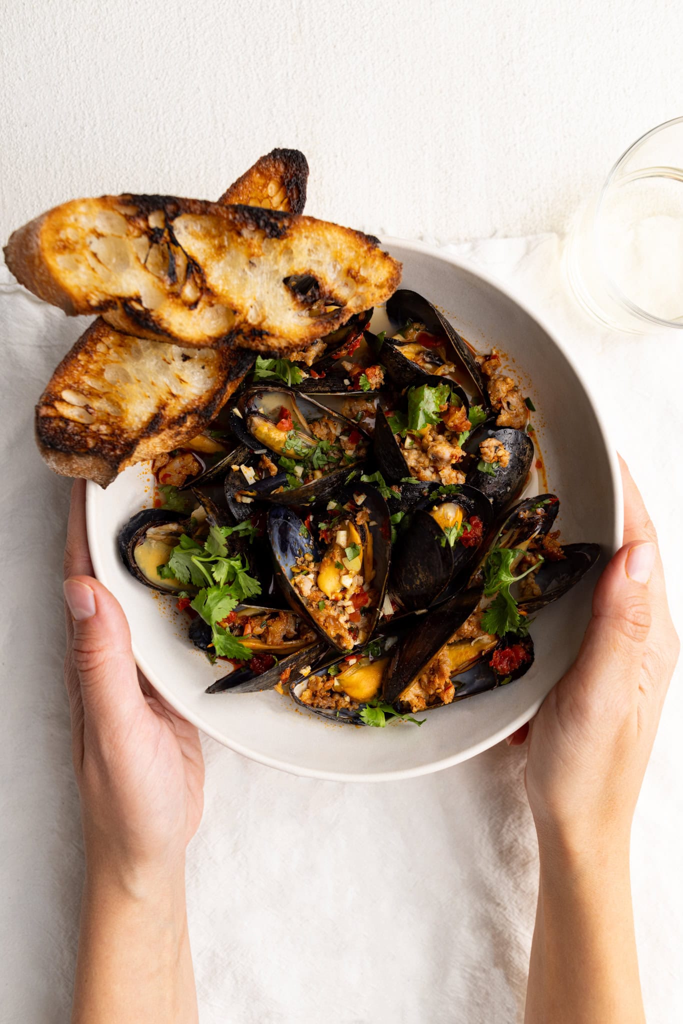 Spicy mussels, anyone? Whether you’re looking for a light appetizer or mussels for two, these Spicy Mussels in White Wine Sauce offer a bold twist on the classic. With flavors like Calabrian peppers, spicy Italian sausage, and fresh cilantro, this dish is ready in under 30 minutes. It’s perfect for date night, a dinner party, Sunday dinner, or even a casual weeknight when you’re craving mussels.