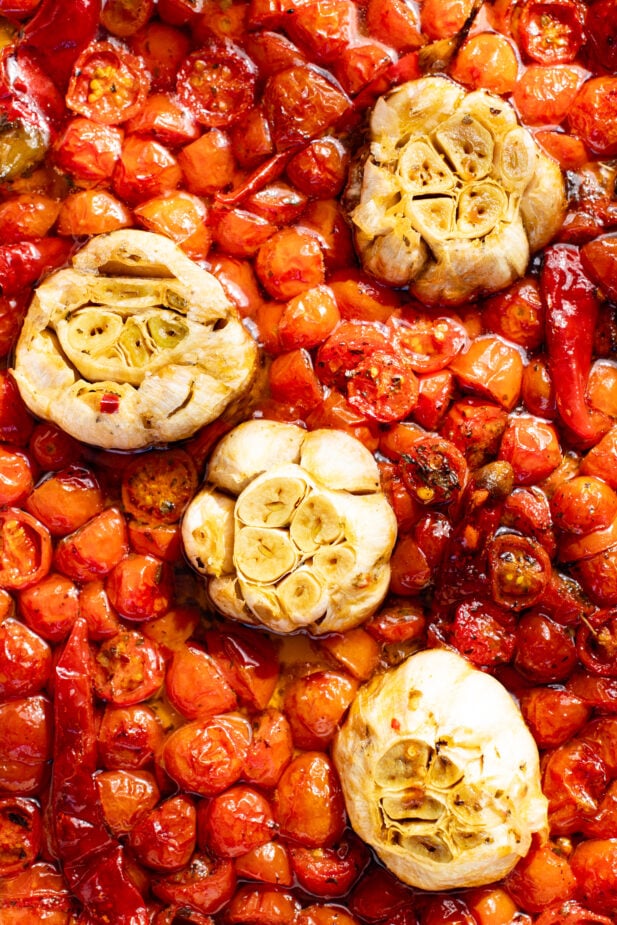 Layer in the Calabrian chilies and pour in the olive oil, making sure not to miss pouring it over the garlic bulbs. You’re aiming to not submerge the tomatoes entirely; pour until they are 3/4th submerged.