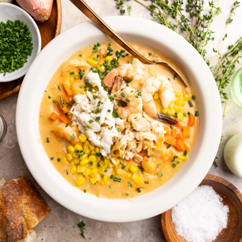Pour in the heavy cream and bring the pot back to a gentle simmer. Add the seafood and cook for another 5 minutes, or until the shrimp are fully cooked. Serve!