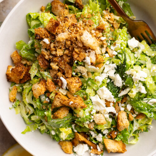 This Maroulosalata has crisp romaine lettuce smothered in a salty, bright homemade feta dressing and topped with crispy breadcrumbs.