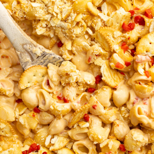 If working with an oven safe pan crumble the crackers over the top of the mac and cheese. If moving the mac and cheese to an oven safe dish, transfer then add the cracker topping.